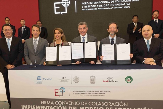 La Secretaría de Educación Pública (SEP) y la empresa Audi México firmaron un convenio de colaboración para la Implementación del Modelo de Formación Dual, con la participación de 200 aprendices de la planta instalada en Puebla, quienes egresarán en fecha próxima con el grado de Técnico Superior Universitario (TSU) y podrán insertarse de forma exitosa al sector productivo.