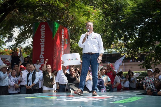 A tres semanas de los comicios, Meade instó a apoyar su proyecto y a apostarle al futuro y a la certidumbre, apostar a los créditos a la palabra para las mujeres, al Seguro Social en el trabajo doméstico, al campo con mejores apoyos, a casas de día para los adultos mayores, a la seguridad educación y a la salud.