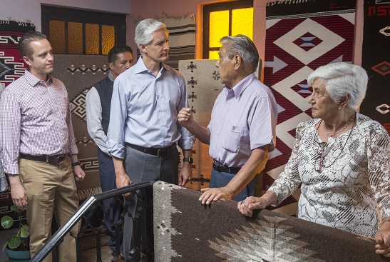 El mandatario estatal visitó el taller de Ezequiel Delgado Martínez, pionero en producir tapetes en telar, oficio que practica desde los 15 años de edad; ahí explicó el proceso para elaborar su producto, único en su tipo, el cual desempeña desde hace más de siete décadas.