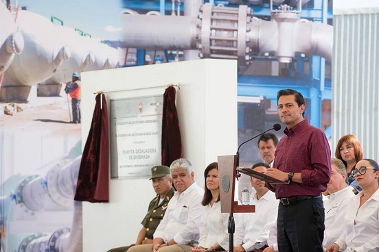 Acompañado por el gobernador de la entidad, Francisco Vega de Lamadrid, el director general de la Comisión Nacional del Agua, Roberto Ramírez de la Parra, y el secretario de Medio Ambiente y Recursos Naturales, Rafael Pacchiano Alamán, destacó la puesta en marcha de la planta desaladora más grande de América Latina, que aumenta 33 por ciento el abastecimiento de agua potable para Ensenada, con posibilidad de crecer su capacidad.