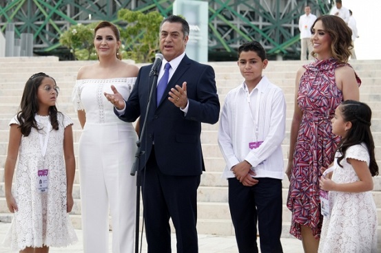El aspirante regiomontano llegó acompañado de su familia y se tomó un momento para saludar a los representantes de los medios de comunicación, quienes aguardan el inicio del evento en la entrada al recinto.