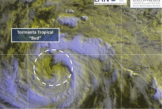 Aunque Bud se degradó esta mañana a tormenta tropical, ocasionará lluvias puntuales torrenciales en Jalisco y Colima, así como intensas en Sinaloa, Nayarit, Michoacán y Guerrero, advirtió el Servicio Meteorológico Nacional (SMN).