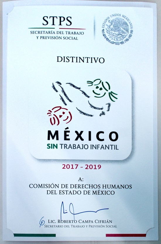 La Comisión de Derechos Humanos del Estado de México (Codhem), recibió de manos del Secretario del Trabajo y Previsión Social (STPS), Roberto Campa Cifrián, el Distintivo México sin Trabajo Infantil, por la promoción de los derechos de las niñas, niños y adolescentes.