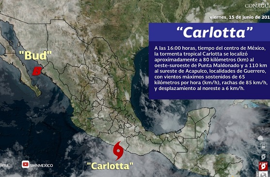 El organismo de la Comisión Nacional del Agua (Conagua) indicó que la tormenta tropical Carlotta se formó a partir de la depresión tropical 4-E, que se localizó esta tarde a 95 kilómetros al sur-sureste de Acapulco y a la misma distancia al oeste-sureoeste de Punta Maldonado, Guerrero.
