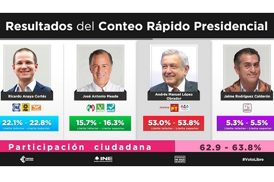 En un mensaje Córdova Vianello indicó que López Obrador tendría entre 53 y 53.8 por ciento de los votos, seguido por el abanderado de Por México al Frente, Ricardo Anaya, con entre 22.1 y 22.8, del candidato de Todos por México, José Antonio Meade, con entre 15.7 y 16.3, y Jaime Rodríguez Calderón, con entre 5.3 y 5.5.