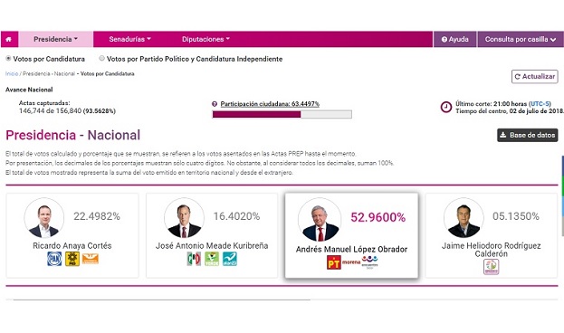 De acuerdo con información del Programa de Resultados Electorales Preliminares (PREP), en su reporte de las 21:00 horas, López Obrador se perfila con 52.96 por ciento de la votación.