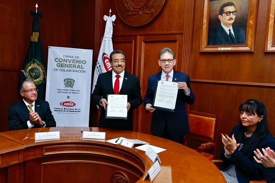 Para fomentar la investigación y el desarrollo profesional, así como la innovación en unidades de aprendizaje relacionadas con esta área del conocimiento y el impulso de la ciencia y la tecnología, la Universidad Autónoma del Estado de México signó un convenio de colaboración con la Delegación Estado de México de la Cámara Mexicana de la Industria de la Construcción (CMIC).