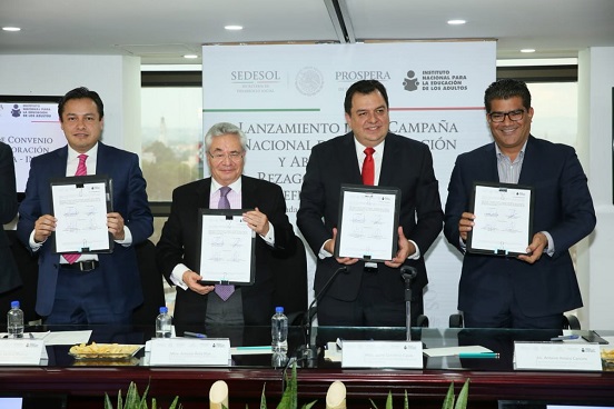 El coordinador nacional de Prospera, Jaime Gutiérrez Casas, y el director general del Instituto Nacional para la Educación de los Adultos (INEA), Gerardo Molina Álvarez, encabezaron el lanzamiento de la Campaña Nacional de Alfabetización y Abatimiento del Rezago Educativo para Beneficiarios Prospera.