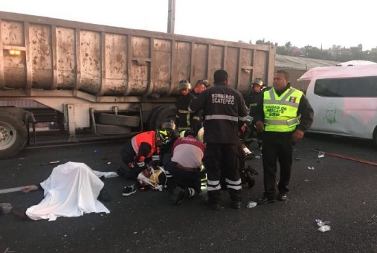 Una vagoneta de transporte público, tipo Urvan con placas 060753X perteneciente a Transportes Ecatepec, SA de CV, aparentemente a exceso de velocidad y circulando por el acotamiento, se impactó contra un tractocamión placas 050EY5 que estaba presuntamente descompuesto y parado en el lugar del incidente.