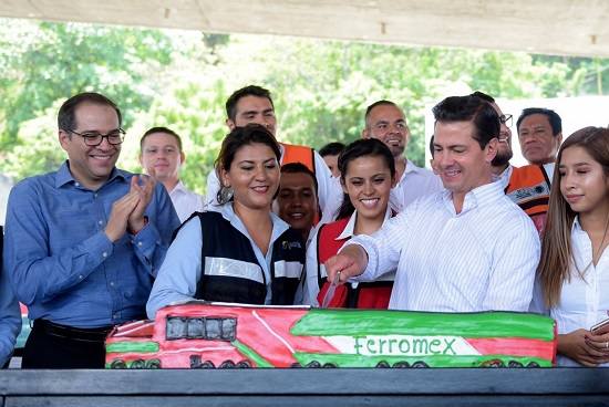 Al final del acto, Peña Nieto recibió un pastel de cumpleaños con forma de una máquina de ferrocarril, con el distintivo de Ferromex (Ferrocarriles de México), y luego de partirlo y compartir con los asistentes, afirmó que la celebración es por México “para que siga siendo un país grande, creciendo y de orgullo para todos”.