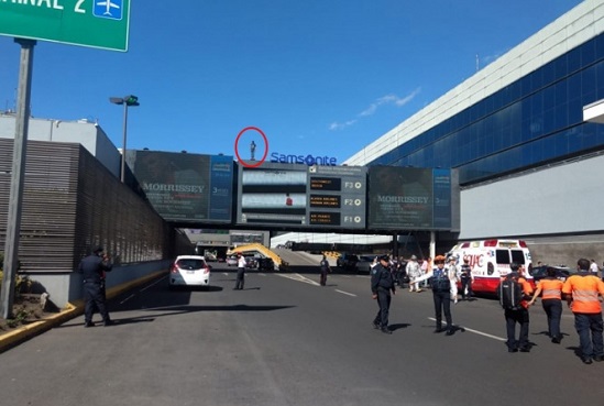 Al rededor de las 17:30 horas, un indigente de nombre Gilberto, de 45 años de edad, se aventó a la calle desde un puente peatonal -de alrededor de 20 metros de altura- ubicado afuera de una de las puertas de la terminal 1 del Aeropuerto Internacional de la Ciudad de México.