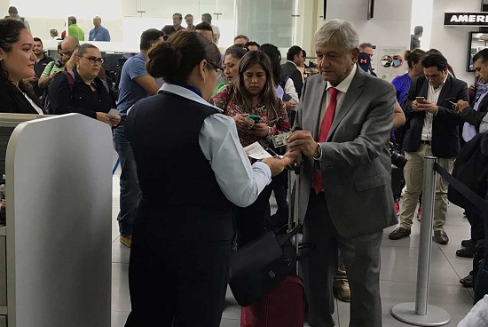 Andrés Manuel López Obrador, ganador de la elección presidencial, llegó al Aeropuerto Internacional de Ciudad de México (AICM) para tomar un vuelo comercial rumbo a Ciudad Juárez, Chihuahua, donde mañana martes inaugurará el primero de los foros de discusión sobre la pacificación del país.