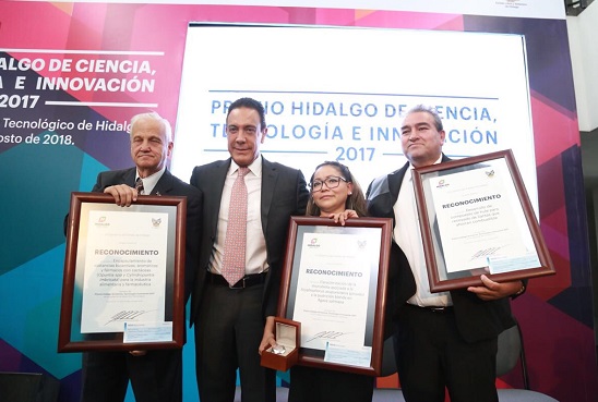 De esta forma, otorgó el Premio Hidalgo de CTI 2017 al mérito «Investigación Científica» a la Doctora Teresa Romero Cortés por su aportación científica en estrategias de control a la infestación de la planta del maguey.