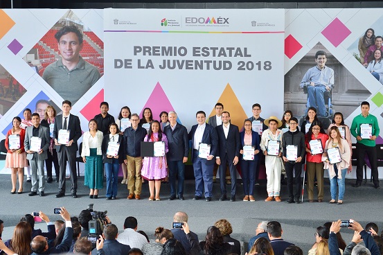 Por realizar acciones a favor de su entorno social, educativo, ambiental y cultural, el Gobernador Alfredo Del Mazo Maza entregó el Premio Estatal de la Juventud 2018, a 23 mujeres y hombres destacados, a quienes les reiteró su compromiso para continuar apoyándolos al ser ejemplo de superación y orgullo del Estado de México.