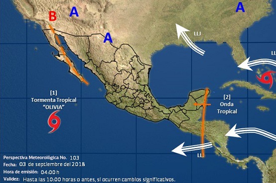 El Servicio Meteorológico Nacional (SMN) reportó que la tormenta tropical Olivia continuará este lunes alejándose del territorio nacional, sin embargo ocasionará aporte de humedad hacia el sur de la Península de Baja California.