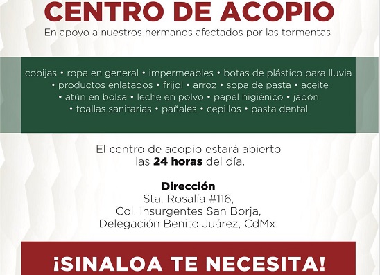 Durante las 24 horas del día, se recibirá la ayuda para la población damnificada de Sinaloa, en el Centro de Acopio instalado en la Oficina de la Representación del Gobierno de Sinaloa en la Ciudad de México.