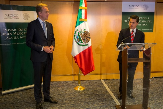 En el marco de esta Cumbre, el Presidente Enrique Peña Nieto impuso la Condecoración de la Orden Mexicana del Águila Azteca a Borge Brende, Presidente del Foro Económico Mundial y ex Ministro de Asuntos Exteriores de Noruega, por su destacada contribución al fortalecimiento de la relación México-Noruega.