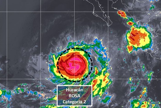 El Servicio Meteorológico Nacional (SMN) informó que el huracán Rosa de categoría 2 se localiza al suroeste de la Península de Baja California.