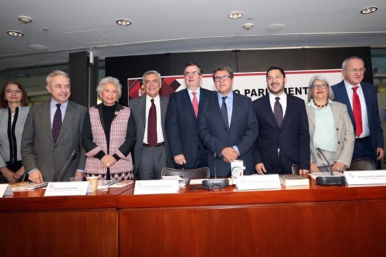 En la sede del Senado, Marcelo Ebrard; Jesús Seade Kuri, negociador del nuevo Acuerdo Comercial Estados Unidos, México y Canadá (USMCA) y Graciela Márquez, próxima titular de Economía, se reunieron en privado con la bancada de Morena en el Senado.