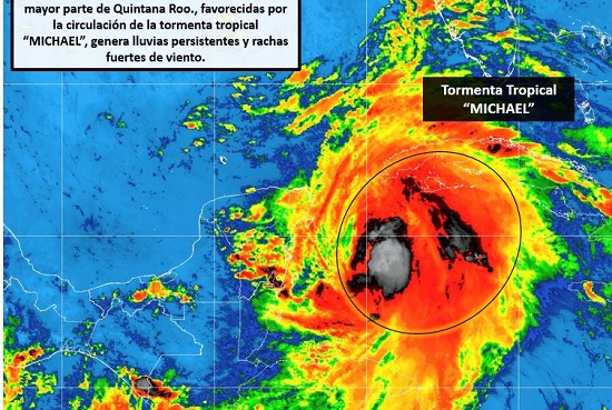 La tormenta tropical Michael, con vientos sostenidos de 65 kilómetros por hora, se localiza frente a las costas de Quintana Roo, lo que provocará lluvia y oleaje elevado en la Península de Yucatán, informó la Comisión Nacional del Agua (Conagua).