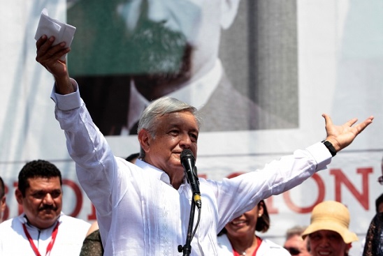 Al encabezar un acto público en la Plaza de Armas de la entidad, ante vecinos de diferentes municipios, con pancartas de bienvenida y peticiones, también recalcó que «contra viento y marea» se construirá la refinería y habrá mucho trabajo, y pidió su apoyo para reactivar la exploración y perforación de pozos petroleros.