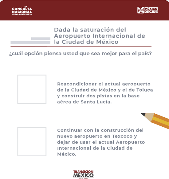 En la página de Internet http://mexicodecide.com.mx, está disponible la imagen de la boleta que señala: “Dada la saturación del Aeropuerto Internacional de la Ciudad de México, ¿cuál opción piensa usted que sea la mejor opción para el país?”.