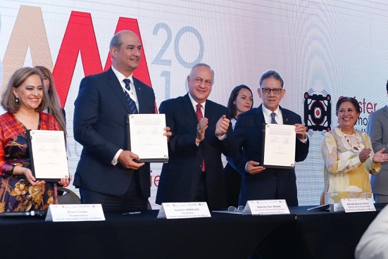 El rector de la Universidad Autónoma del Estado de México, Alfredo Barrera Baca, y el presidente del Clúster Automotriz Estado de México, Gunther Barajas, firmaron un convenio general de colaboración, que tiene como propósito impulsar la investigación científica y tecnológica, así como formar capital humano calificado que permita elevar la productividad y competitividad de este sector en la entidad.
