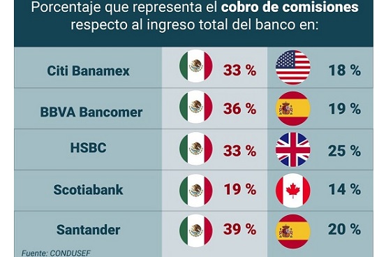 Este cuadro comparativo muestra las diferencias porcentuales entre las comisiones que cobran las instituciones bancarias en #México y sus países de origen. Exigir un trato justo no es inoportuno o desproporcionado, y sí es irrenunciable.