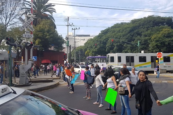 Los inconformes, aproximadamente 30 a 40 mujeres, agarradas de las manos y con carteles obstruyen la circulación vehicular y el paso del Tren Ligero, a la altura de la estación Xomali, lo que provoca congestionamientos viales en la zona.