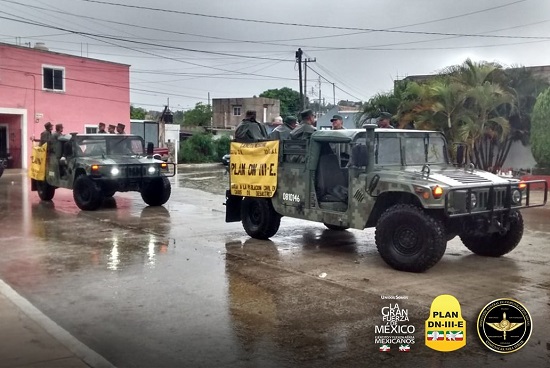 Debido a las condiciones climatológicas que prevalecen en Campeche, con lluvias intensas y rachas de viento superiores a 70 km por hora, personal del décimo Batallón de Infantería aplica el Plan DN-III-E en su “Fase de prevención”, mediante la realización de recorridos en las colonias Siglo XXI y Plan Chac.