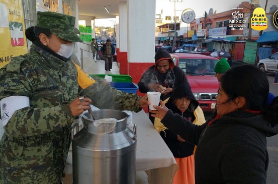 La institución militar señaló que en el marco de la implementación del Plan DN-III-E, ante el intenso frío proporciona, entre otras acciones, bebidas calientes y pan en los municipios de Álamo y Gutiérrez Zamora, en el norte del estado.