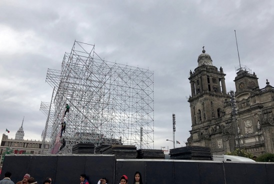 Por las rendijas es posible captar a alrededor de 50 personas o más que trabajan a toda máquina, el ruido del golpeteo de los martillos para levantar las extensas estructuras metálicas que darán cabida a la toma de protesta del presidente electo Andrés Manuel López Obrador se mezcla con el concierto que dan los dirigentes de las distintas organizaciones agrarias.
