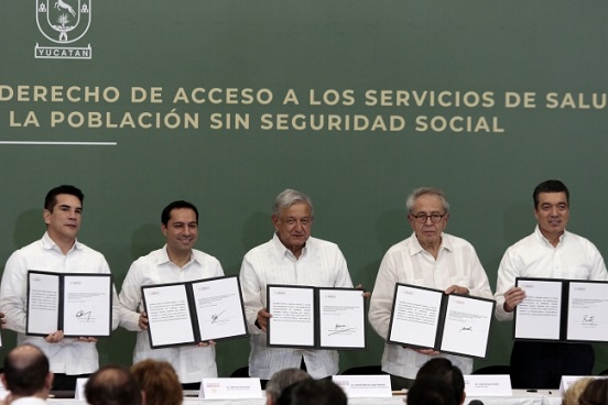 El presidente Andrés Manuel López Obrador y ocho gobernadores del sur-sureste mexicano firmó, junto con ocho gobernadores del sur-sureste del país, el acuerdo para la federalización del sector salud, con lo que se busca garantizar el derecho de acceso a los servicios en la materia y medicamentos gratuitos a la población sin seguridad social.