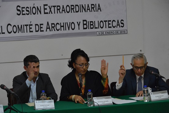 Durante la reunión extraordinaria llevada a cabo en el Salón Heberto Castillo, el secretario del Comité, legislador Jorge Gaviño e integrante también del Grupo Parlamentario del PRD, leyó uno de los oficios que fue turnado al presidente de la Junta de Coordinación Política (Jucopo), diputado Ricardo Ruiz Suárez en el que se refiere al Acuerdo para el apoyo del funcionamiento de las bibliotecas, el depósito legal y actividades de la materia, documento que le fue comunicado el pasado 27 de diciembre.