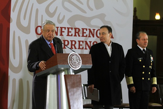 Acompañado de los secretarios de Trabajo y Previsión Social, Luisa María Alcalde; de Gobernación, Olga Sánchez Cordero, y de Seguridad y Protección Ciudadana, Alfonso Durazo, recordó que con el combate al robo de combustible se busca terminar con la corrupción y con el huachicoleo, para que no haya delincuencia dedicada al robo de bienes públicos ni de cuello blanco.