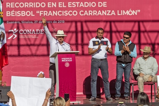 En su visita a este municipio, fue al Estadio “Francisco Carranza Limón”, acompañado por la titular de la Comisión Nacional del Deporte (Conade), Ana Gabriela Guevara, y señaló que con esta medida cumple su compromiso de regresar este deporte a la zona; aseguró que este año estará jugando el equipo Algodoneros de Guasave.