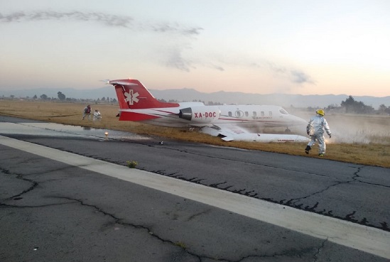La ambulancia aérea, en la que viajaban siete pasajeros y dos tripulantes, volaba de Toluca al Aeropuerto Internacional del Bajío, en Guanajuato, cuando solicitaron su regreso por emergencia y al momento del aterrizaje sufrió excursión de pista.