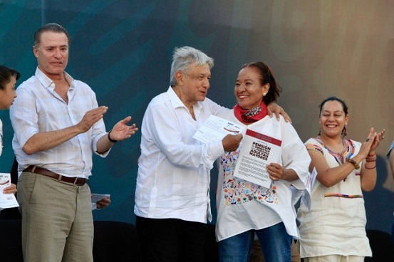 En el estadio de béisbol «Teodoro Mariscal», recordó que la pensión a adultos mayores es universal y registra un incremento del doble de la que recibían antes. El apoyo se otorgará a las personas a partir de los 68 años de edad, de manera universal, en tanto que en las comunidades indígenas será a partir de los 65.
