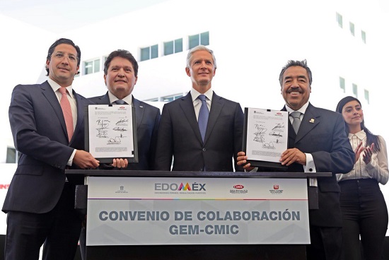 El Gobernador Alfredo Del Mazo Maza atestiguó una firma de convenio entre el Gobierno del Estado de México y la Cámara Mexicana de la Industria de la Construcción (CMIC), donde destacó la calidad y responsabilidad con la que trabajan los afiliados de ésta, en las obras de infraestructura social y de alto impacto, lo que permite que la entidad se consolide como promotora de inversiones.