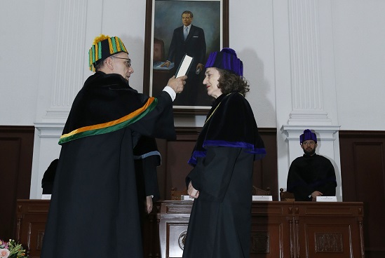 Por su contribución a la investigación educativa y su compromiso con el fortalecimiento de instituciones de enseñanza acordes a los retos mundiales, la Universidad Autónoma del Estado de México confirió el grado de Doctora Honoris Causa a la profesora emérita de la Universidad de Barcelona, Juana María Sancho Gil.