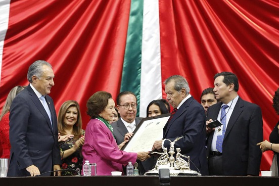 En manos del presidente de la Cámara baja, Porfirio Muñoz Ledo, la homenajeada recibió la distinción, quien reconoció al actual gobierno de Andrés Manuel López Obrador a quien llamó a tener una política en favor de la sociedad y de todo el país.