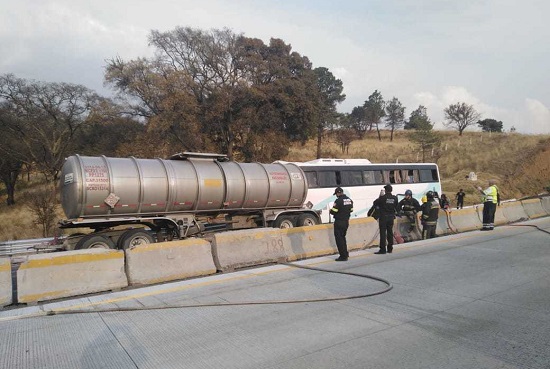 Esta tarde se registró un choque entre un autobús de pasajeros y una pipa de doble remolque cargada de turbosina, a la altura del municipio de Ixtapaluca, sobre el kilómetro 43.5 de la autopista México-Puebla, en dirección a la Ciudad de México, el cual dejó al menos 37 personas lesionadas.