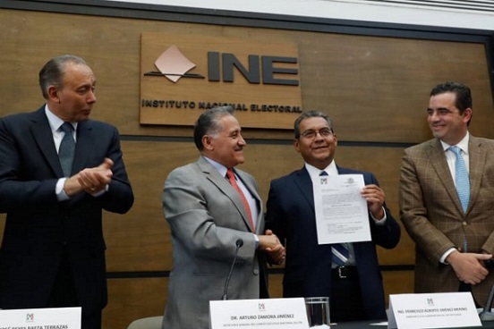 En su intervención, Zamora Jiménez dijo que la entrega de la solicitud “es una manera emblemática de reiterar la confianza que tenemos en el INE como garante efectivo de la imparcialidad, legalidad y libertad del voto”.