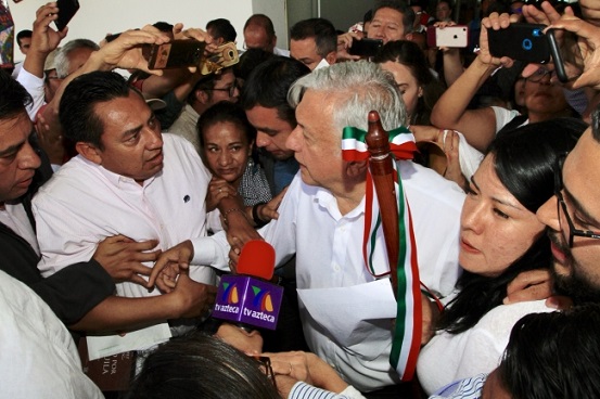 En el marco de su llegada a la terminal aérea del estado, donde fue recibido por el gobernador Alejandro Murat Hinojosa, los habitantes le entregaron al mandatario federal dos bastones de mando.