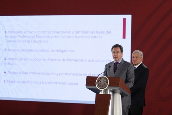 Ante el presidente Andrés Manuel López Obrador, Moctezuma Barragán refrendó que no habrá evaluaciones punitivas ni obligatorias para los maestros, quienes tendrán derecho a un sistema de formación gratuito, con el compromiso de la reinstalación de los docentes cesados luego de la reforma previa.