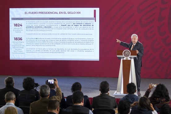 Después, agregó, «en la Constitución federal liberal de 1857» se agregó de que puede juzgarse al Presidente por delitos electorales, por traición a la patria, pero no por corrupción, mientras que en la de 1917, la que está vigente, tampoco se incluye que sea juzgado por corrupción.