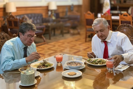 El presidente de México, Andrés Manuel López Obrador, desayunó este día con el coordinador de Morena en el Senado, Ricardo Monreal Ávila, con quien compartió un menú conformado por el tradicional platillo mexicano chilaquiles, frijoles y jugo.