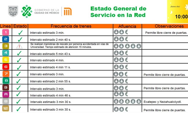 En la imagen publicada en su cuenta @MetroCDMX de la red social aparece una columna con las 12 líneas que con un signo de paloma en color verde indica que el tránsito entre cada tren es continuo, mientras que en otra fila establece la frecuencia entre los mismos, que varía entre 2.40 minutos a poco más de cuatro.