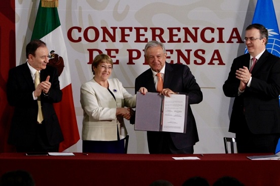 El instrumento fue firmado por la alta comisionada para los Derechos Humanos de la ONU, Michelle Bachelet; el secretario de Relaciones Exteriores, Marcelo Ebrard, y el presidente López Obrador, quien fungió como testigo de honor.