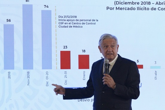Detalló que del 1 al 20 de diciembre se reportó el robo de 74 mil barriles, del 21 al 31 de ese mes se logró bajar a 23 mil barriles diarios, mientras que el promedio en enero fue 18 mil; en febrero, nueve mil; marzo, ocho mil, y en lo que va de abril es de cinco mil.